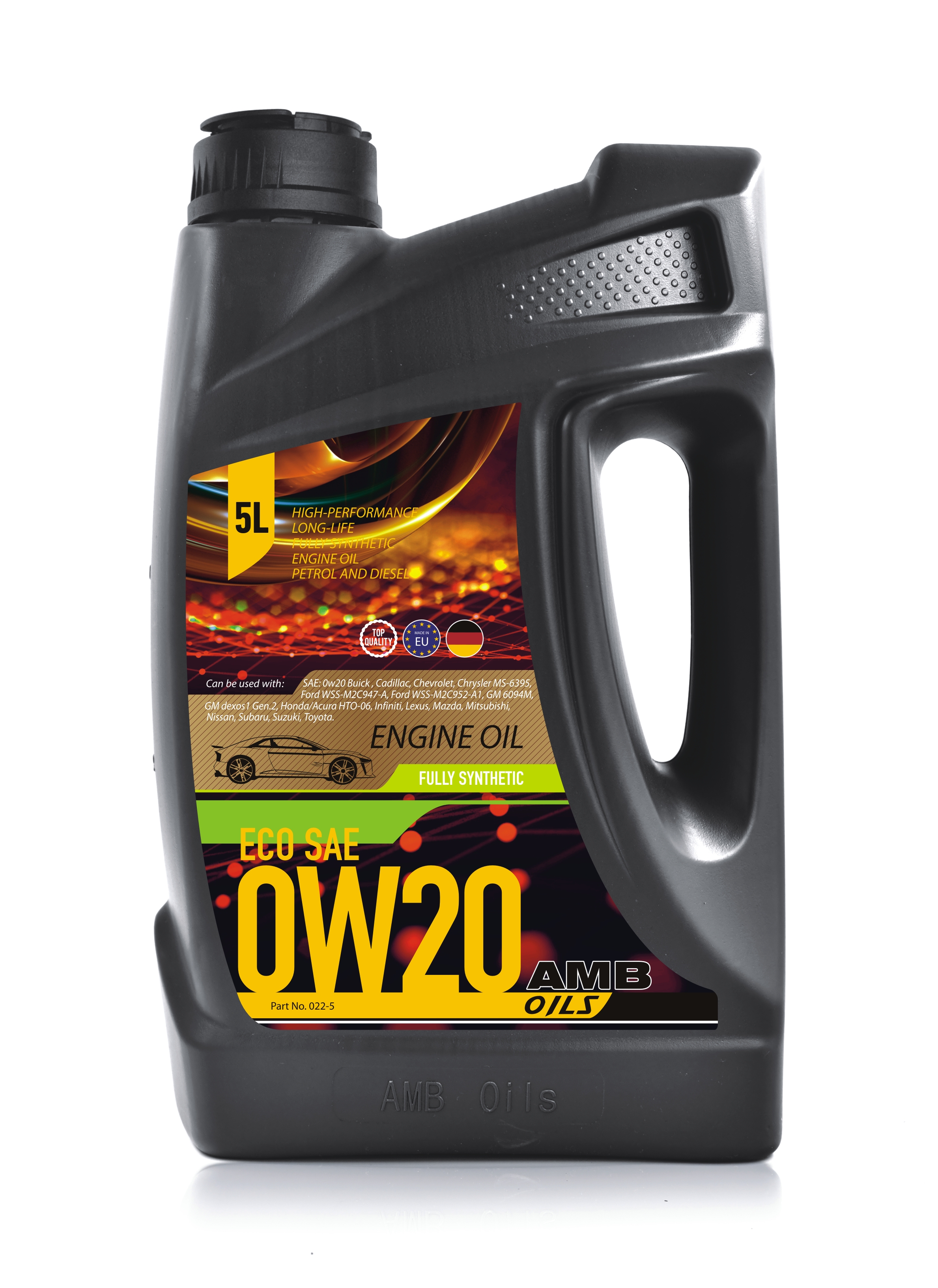 AMB Oils ECO SAE 0w20 is fully synthetic, low friction engine oil for all petrol and diesel passenger cars with and without turbo charger. AMB Oils ECO SAE 0w20 is characterized by excellent cold starting behavior which gives safe lubricating in cold-phase, with special additives minimisation of fuel consumption as well as wear and corrosion is excellent. Extended oil changing intervals as recommended per manufacturer. AMB Oils ECO SAE 0w20 is suitable for the energy saving operation for all modern engines with gasoline and diesel engines.