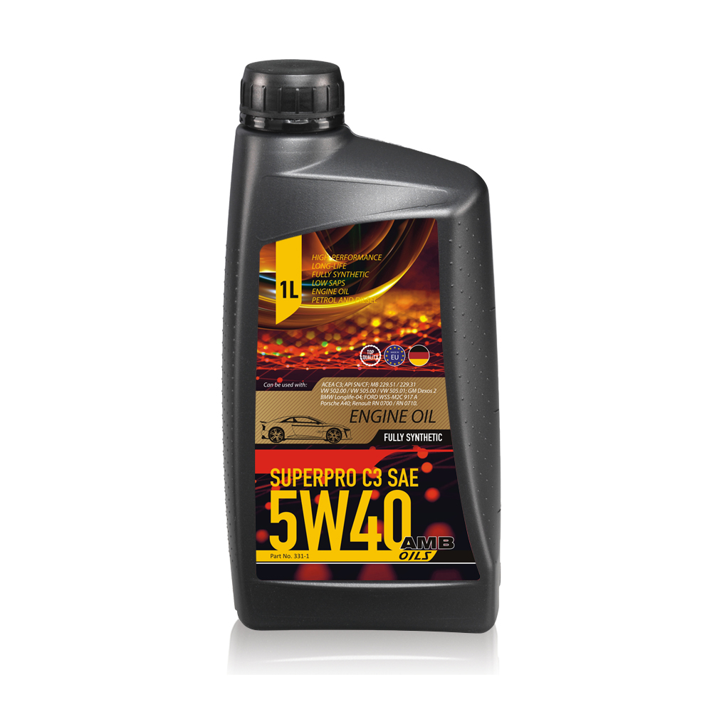 AMB Oils SuperPro C3 SAE 5w40 is a fully synthetic, low SAPS, low friction, high-performance engine oil for all petrol and diesel passenger cars and vans with and without turbo charger.AMB Oils SuperPro C3 SAE 5w40 is characterized by excellent cold starting behaviour, minimization of fuel consumption as well as wear, friction and corrosion. With AMB Oils SuperPro C3 SAE 5w40 was a reliable and heavy-duty engine oil developed, in order to guarantee the low viscosity of the SAE 5W-class as well as the low evaporation loss.AMB Oils SuperPro C3 SAE 5w40 guarantees operation safety concerning all driving conditions as for example regarding extreme stop and go traffic as well as high speed driving on motorways.