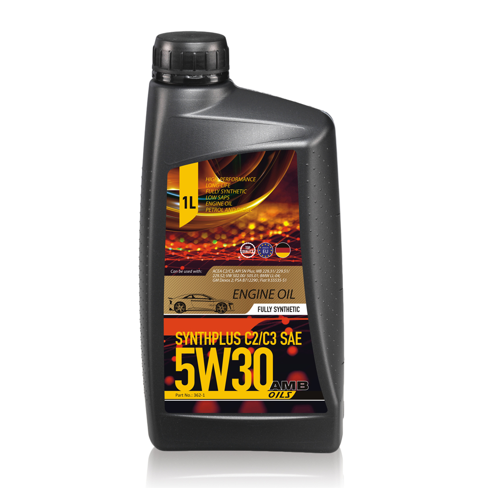 AMB Oils SynthPlus C2/C3 SAE 5w30 is LOW SAPS, Multi-grade, fully synthetic engine oil for all petrol and diesel passenger cars with and without turbo charger. Suitable for engines with DPF.AMB Oils SynthPlus C2/C3 SAE 5w30is characterized by excellent cold starting behavior which gives safe lubricating in cold-phase, with special additives minimisation of fuel consumption as well as wear and corrosion is excellent. Extended oil changing intervals as recommended per manufacturer. AMB Oils SynthPlus C2/C3 SAE 5w30 is LOW SAPS oil which prevents effectively the reset of the diesel soot particulate filter.AMB Oils SynthPlus C2/C3 SAE 5w30 is suitable for the energy saving operation for all modern engines with gasoline and diesel engines. Recommended for use in vehicles with diesel particulate filters.