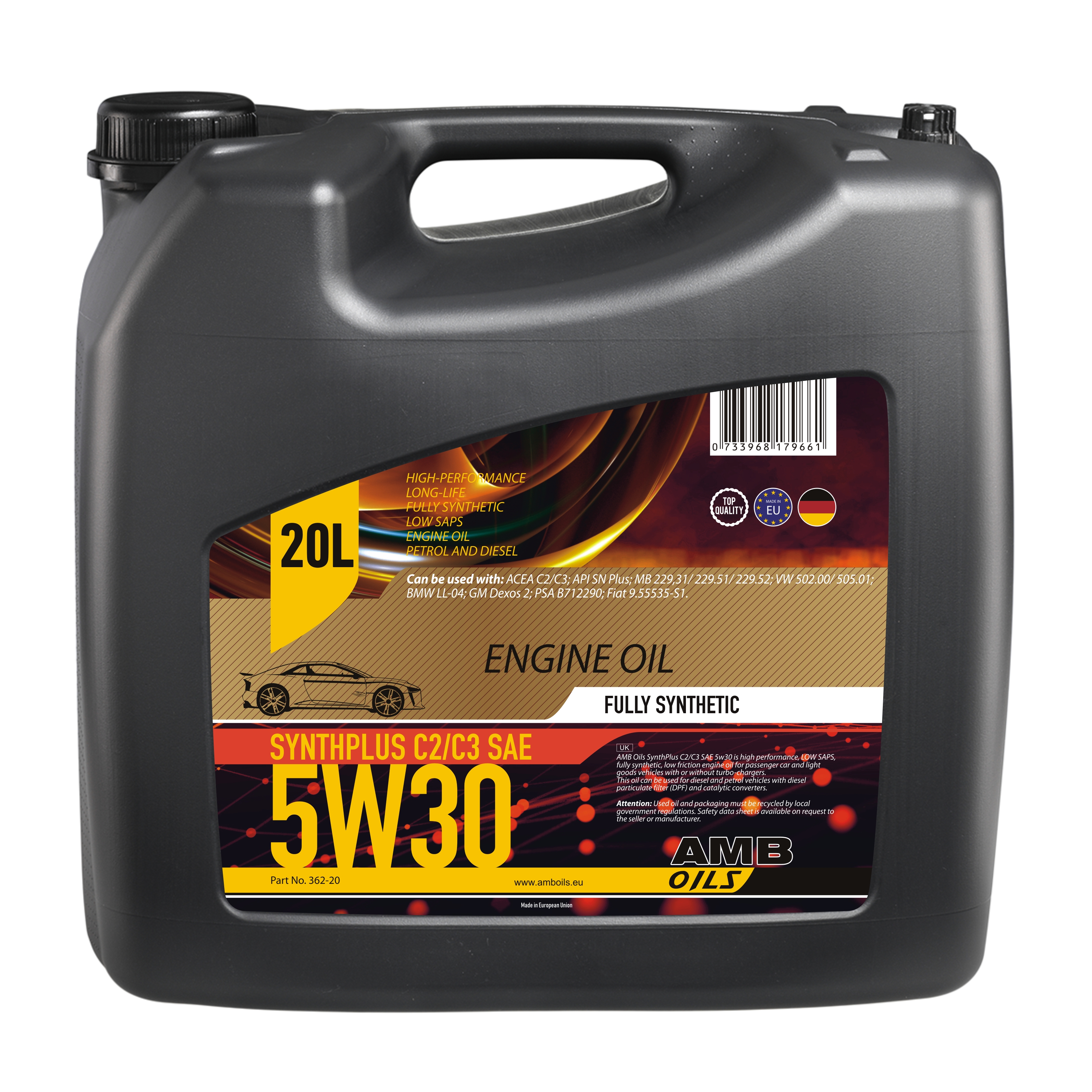 AMB Oils SynthPlus C2/C3 SAE 5w30 is LOW SAPS, Multi-grade, fully synthetic engine oil for all petrol and diesel passenger cars with and without turbo charger. Suitable for engines with DPF.AMB Oils SynthPlus C2/C3 SAE 5w30is characterized by excellent cold starting behavior which gives safe lubricating in cold-phase, with special additives minimisation of fuel consumption as well as wear and corrosion is excellent. Extended oil changing intervals as recommended per manufacturer. AMB Oils SynthPlus C2/C3 SAE 5w30 is LOW SAPS oil which prevents effectively the reset of the diesel soot particulate filter.AMB Oils SynthPlus C2/C3 SAE 5w30 is suitable for the energy saving operation for all modern engines with gasoline and diesel engines. Recommended for use in vehicles with diesel particulate filters.