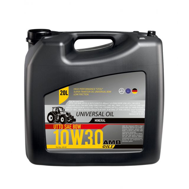 AMB Oils Universal UTTO SAE 10w30 is a special oil, combined transmission and hydraulic oil on the basis of solvent refined base oil. Additives ensure troubles free operation of all aggregates at any season. AMB Oils Universal UTTO SAE 10w30 is tractors and construction with common oil circuit of transmission, final drives and hydraulic systems.AMB Oils Universal UTTO SAE 10w30 is suitable for wet brakes in particular with asbestos-free brakes pads and load clutches PTO's set of load changes coupling and minor drives.